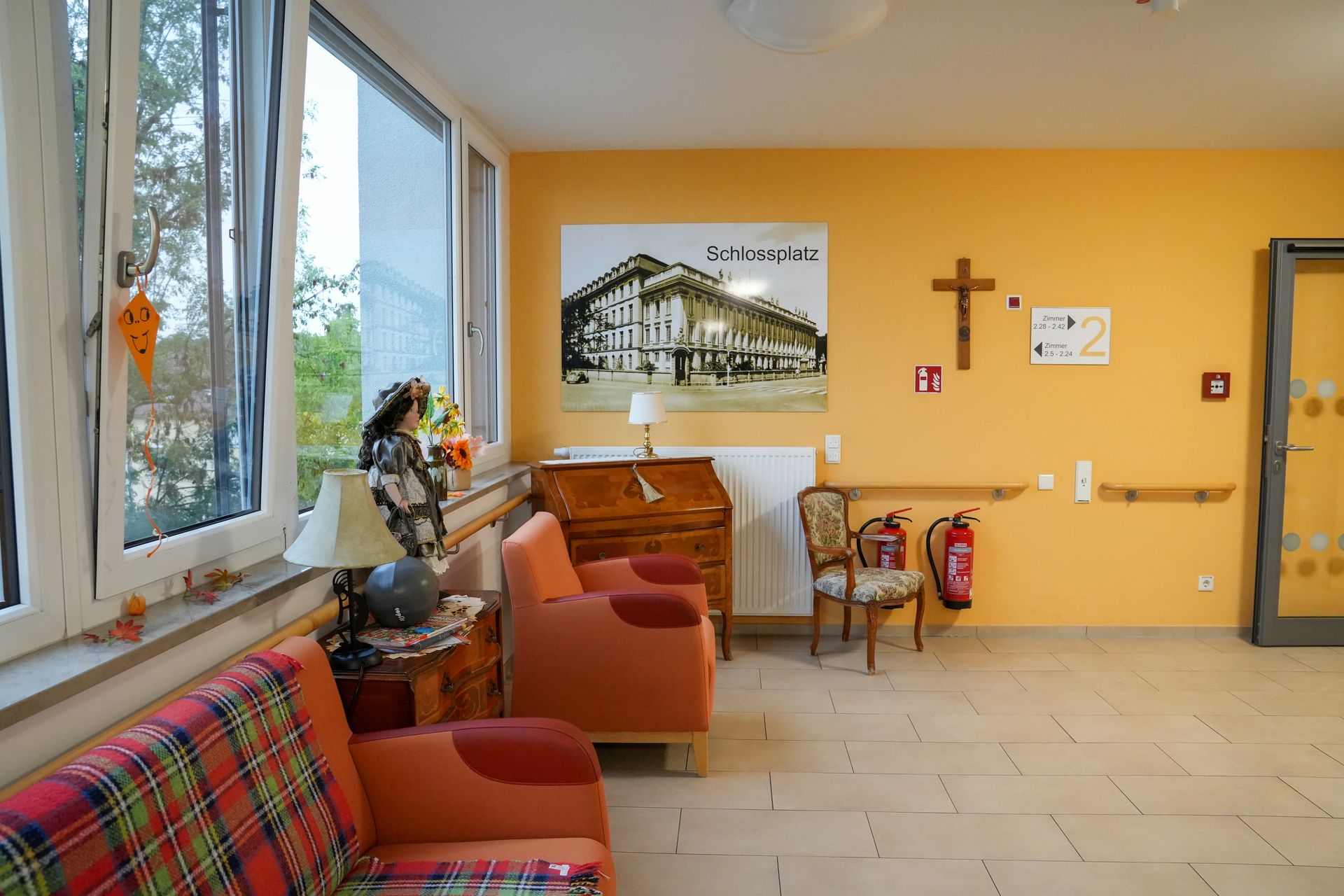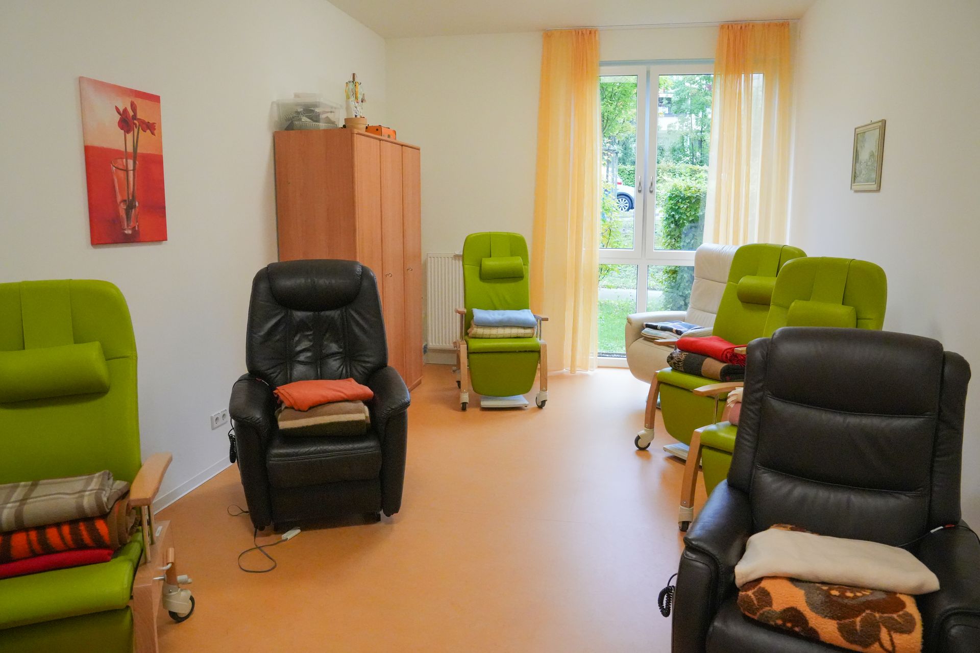 Die Zimmer sind ausgestattet mit einem elektrisch verstellbaren Pflegebett, Kleiderschrank, Nachtkästchen sowie Tisch und Stuhl. Auf Wunsch können eigene Kleinmöbel mitgebracht werden. Anschlüsse für Telefon sowie Rundfunk- und Fernsehgerät sind vorhanden. Alle Zimmer verfügen über eine Schwesternrufanlage.